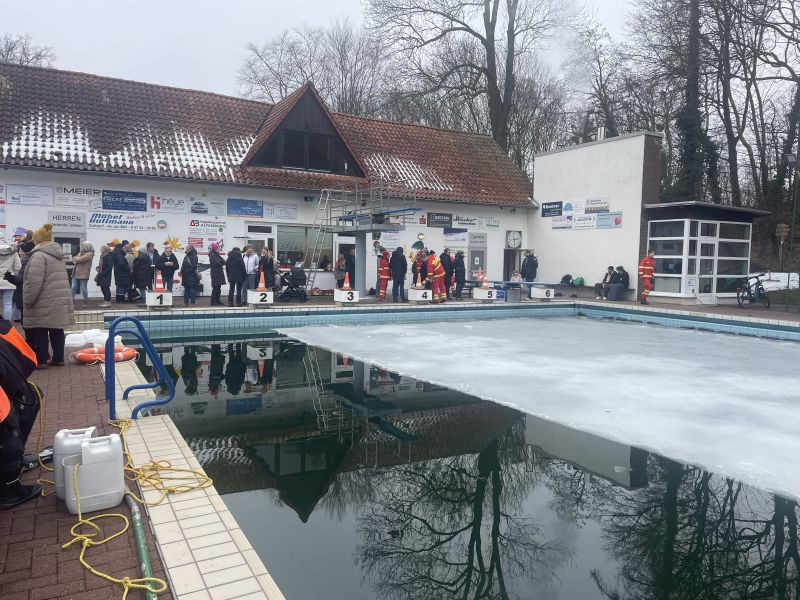 Bei einer Wassertemperatur von nur 3 Grad und einer dicken Eisschicht, die zuvor teilweise entfernt werden musste, bewiesen die Teilnehmenden echten Mut. Trotz der frostigen Bedingungen ließen sich die Schwimmer*innen die gute Stimmung nicht nehmen und wurden am Beckenrand mit Applaus angefeuert.